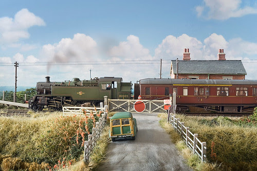 The layout lights were turned off and the natural north facing window light was allowed to stray in. Clunk. The only addition is the fake engine-clag and some pillock called Chris leaning out of the engine. The Morris traveller has been sprayed with a little matt varnish to kill the toy like shine.